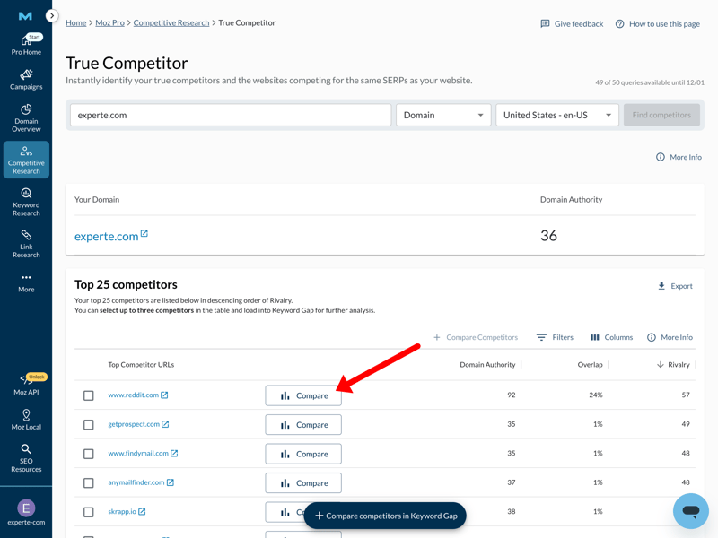 Nach Eingabe einer Domain ermittelt Moz Pro automatisch die Top-25-Wettbewerber. Aus dieser Liste wählen Sie einzelne Seiten aus, die Sie direkt miteinander vergleichen können. Der Ablauf ist dabei klar und nachvollziehbar aufgebaut.