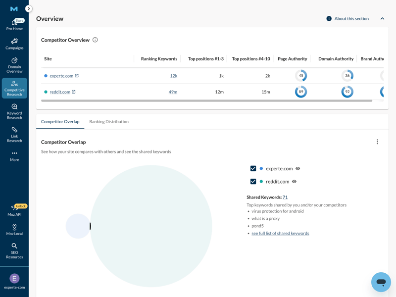 Die Konkurrenzanalyse von Moz Pro eignet sich gut, um Keyword-Überschneidungen zu erkennen und die Autorität von Domains zu vergleichen. Sobald Sie jedoch wirtschaftliche Kennzahlen benötigen – etwa geschätzte Besucherzahlen oder SEA-Budgets –, lässt Moz Pro Sie im Stich.