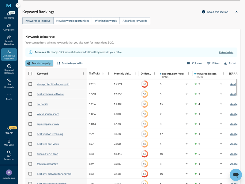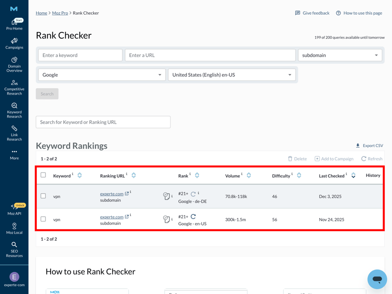 Ein zentraler Bestandteil der Konkurrenzanalyse ist der Blick auf die Keywords der Wettbewerber. Moz Pro zeigt, für welche Suchbegriffe andere Domains ranken, inklusive Positionen, Suchvolumen und Keyword-Schwierigkeit (Difficulty).