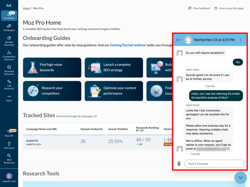 Die statischen Lernressourcen von Moz sind inhaltlich exzellent, sofern man Englisch spricht und bereit ist, sich intensiv einzuarbeiten. Der direkte Support war insgesamt in Ordnung und wird auch in Review-Portalen recht gut bewertet, wobei instabile Live-Chats und widersprüchliche Aussagen den Eindruck für uns trübten.