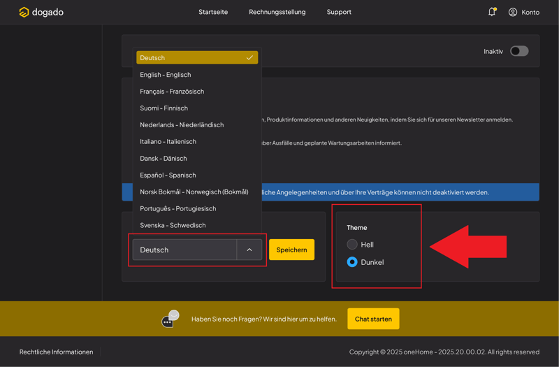 Neben Deutsch, Englisch und Französisch steht das Dashboard auch in vielen weiteren Sprachen zur Verfügung. Ein Dark Mode ist als Anzeigemodus ebenfalls optional verfügbar. Beide Einstellungen erreichen Sie nach einem Klick auf Ihr Profil oben rechts.
