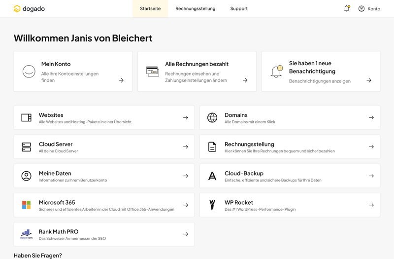 Trotz kleinerer Kritikpunkte hinterlässt das dogado-Dashboard insgesamt einen positiven Eindruck. Die Navigation ist logisch, die Bedienung unkompliziert und das Interface gut verständlich – eine Einarbeitung ist praktisch nicht nötig.