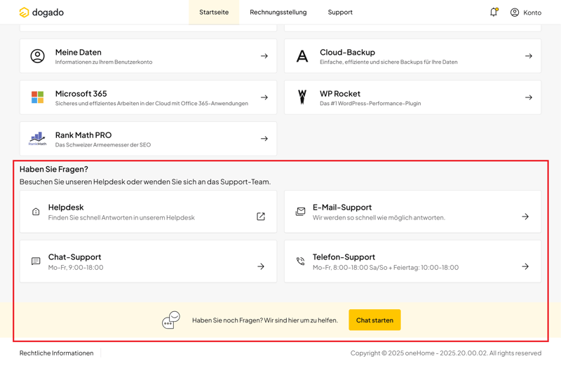 Die wichtigsten Bereiche wie Konto, Rechnungen und Benachrichtigungen finden Sie direkt oben auf der Startseite. Darunter folgen Kategorien wie Websites, Domains oder Cloud Server. Auch neue Nutzer sollten sich hier schnell zurechtfinden.