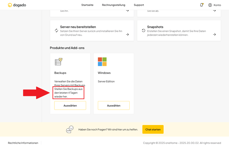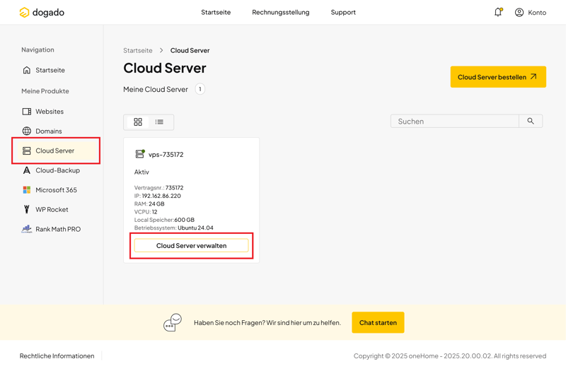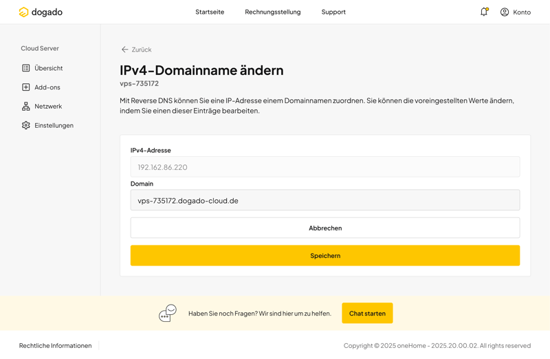 Ein kleiner Schwachpunkt ist der Support-Zugang innerhalb der vServer-Verwaltung. Im Gegensatz zur oneHome-Startseite fehlen dort Hinweise auf einen Helpdesk, eine E-Mail-Adresse oder eine Support-Hotline. Lediglich ein Chat-Button ist sichtbar. Gerade bei Problemen mit der Serverkonfiguration wäre eine direktere Unterstützung sinnvoll.