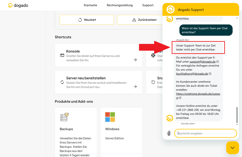 Nie per Chat erreichbar: das Support-Team von dogado.
