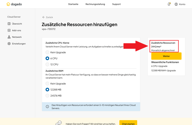 Vorsicht: In vielen Fällen ist ein Wechsel in den nächsthöheren Tarif günstiger als eine Skalierung per Add-on. Das gilt insbesondere für umfangreiche Erweiterungen von vCPUs und RAM. Wenn Ihr vServer langfristig mehr leisten soll, fahren Sie mit einem Tarifwechsel meist besser.