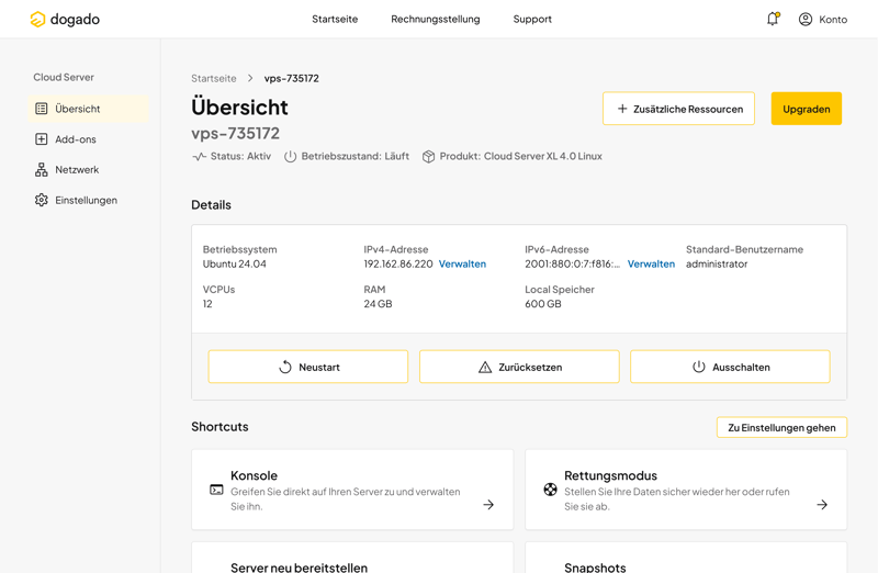 Positiv sind die zahlreichen Schnellzugriffe auf der Startseite. Darüber gelangen Sie direkt zur Web-Konsole, in den Rettungsmodus oder zur Neuinstallation des Betriebssystems. Auch grundlegende Aktionen wie Neustart, Ausschalten oder Zurücksetzen Ihres Servers sind ohne Umwege erreichbar. Die wichtigsten Funktionen sind klar platziert und leicht verständlich.