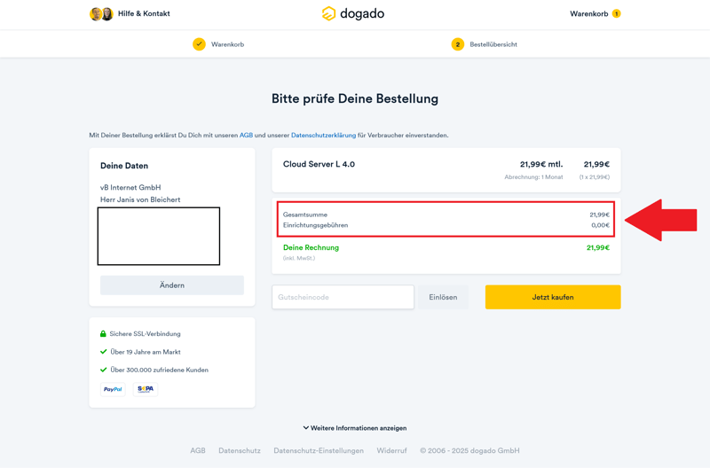 Die Bestellung eines vServers bei dogado ist schnell und unkompliziert: Sie wählen den gewünschten Tarif aus und geben anschließend Ihre persönlichen Daten und Zahlungsinformationen ein. Im Rahmen der Bestellung legt dogado dann ein Kundenkonto für Sie an.