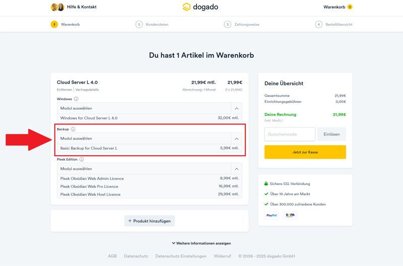 Der eigentliche Bestellprozess ist angenehm schlank. Sie entscheiden zunächst nur, ob Ihr Server mit Linux oder Windows laufen soll und ob Sie ein kostenpflichtiges Backup oder eine Plesk-Lizenz benötigen. Beides lässt sich später jederzeit nachrüsten.
