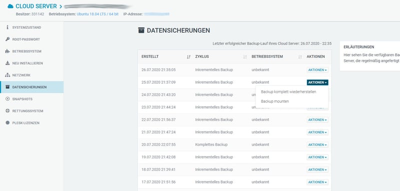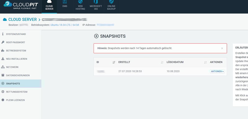 Weniger überzeugend ist der Umgang mit Snapshots: Pro vServer ist nur ein einziger Schnappschuss möglich, der nach exakt 24 Stunden automatisch gelöscht wird. Zusätzliche Snapshots oder längere Aufbewahrungszeiten sind nicht vorgesehen – selbst bei größeren Tarifen nicht.