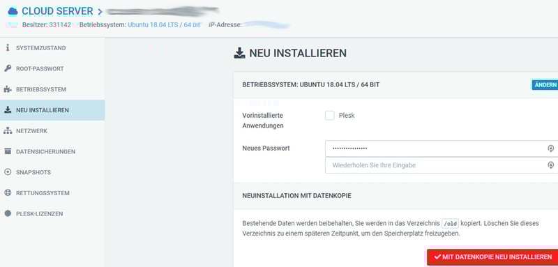 Positiv sind die zahlreichen Schnellzugriffe auf der Startseite. Darüber gelangen Sie direkt zur Web-Konsole, in den Rettungsmodus oder zur Neuinstallation des Betriebssystems. Auch grundlegende Aktionen wie Neustart, Ausschalten oder Zurücksetzen Ihres Servers sind ohne Umwege erreichbar. Die wichtigsten Funktionen sind klar platziert und leicht verständlich.