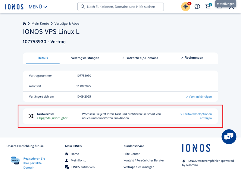 Bei IONOS können Sie schnell in einen höheren Tarif wechseln.