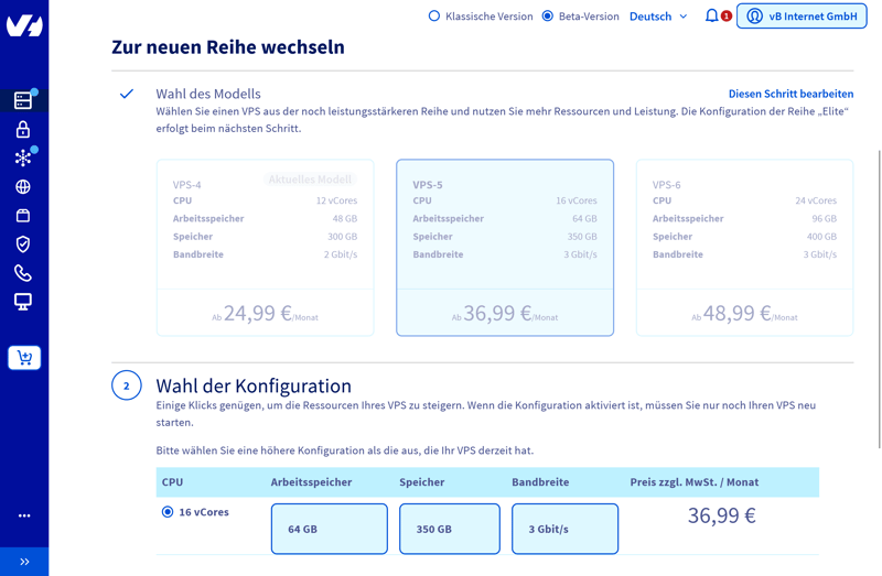 Ein Hardware-Upgrade Ihres vServers ist nur über einen Tarifwechsel möglich. Eine flexible Ressourcenanpassung nach Bedarf gibt es nicht.