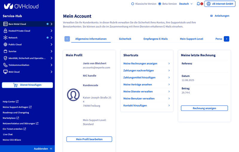 Das OVH-Dashboard bietet viele Funktionen, wirkt aber schnell überladen. Wichtige Informationen sind nicht klar von weniger relevanten Punkten getrennt, und Bereiche wie „Telekommunikation“, die für Hosting-Kunden keine Rolle spielen, machen die Navigation unnötig komplex.