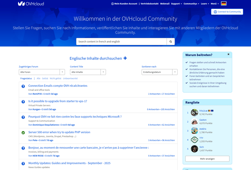 OVH bietet eine umfangreiche Community-Plattform. Die Beiträge kommen jedoch überwiegend von anderen Nutzern; OVH selbst beteiligt sich kaum aktiv. Die Qualität der Antworten schwankt entsprechend stark.