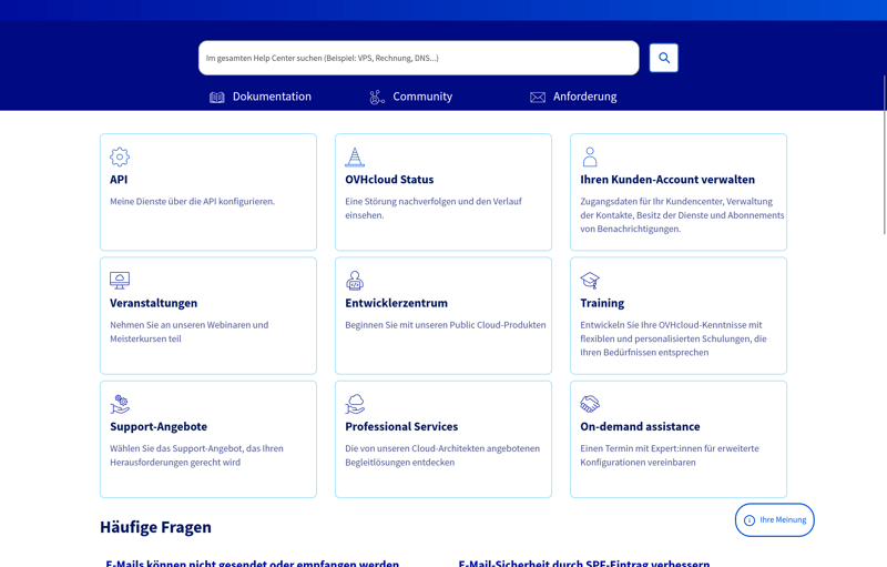 Das Help-Center von OVH ist ausgesprochen ausführlich. Hunderte Artikel decken nahezu jeden Anwendungsfall ab, von Basisthemen bis hin zu sehr spezifischen Konfigurationen. Die Artikel sind meist gut strukturiert und enthalten Schritt-für-Schritt-Anleitungen sowie hilfreiche interne Links.
