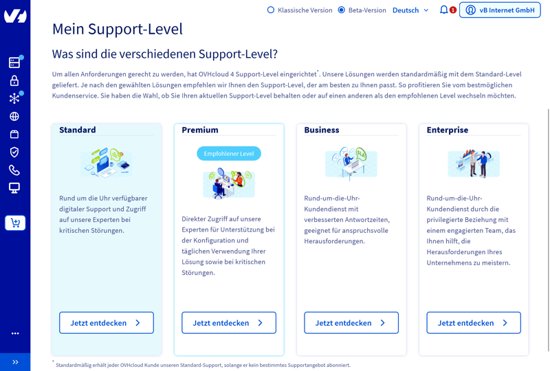 Wenn Ihnen der Standard-Support nicht reicht, können Sie bei OVH zwischen drei weiteren Support-Stufen wählen: Premium, Business und Enterprise. Diese unterscheiden sich vor allem durch Reaktionszeiten, Kommunikationswege und individuelle Betreuung. Professionelle Hilfe gibt es erst gegen Aufpreis.