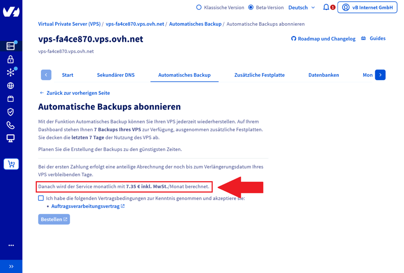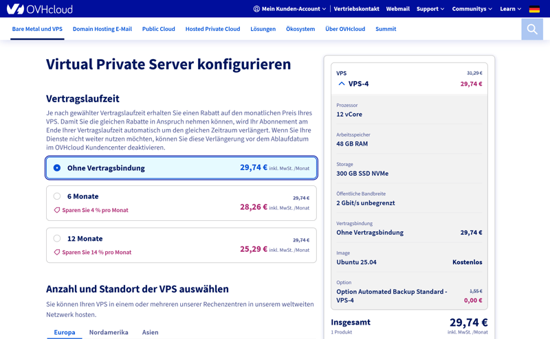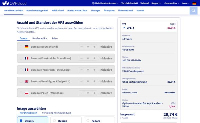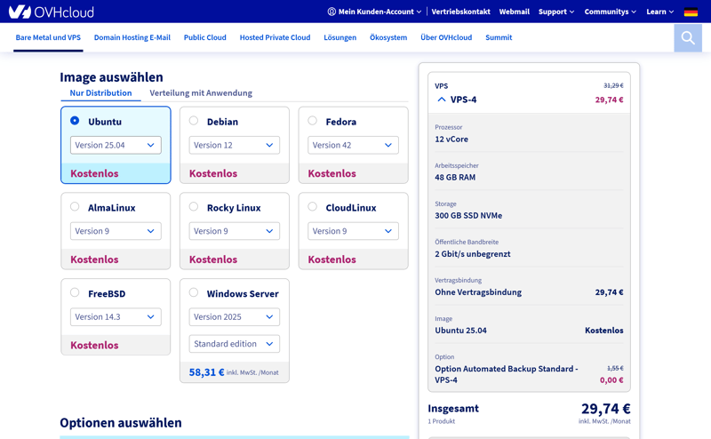 Die Bestellung eines vServers bei OVH ist erfreulich einfach. Sie wählen einen Tarif, legen den Standort fest, entscheiden sich für ein Betriebssystem und können bei Bedarf Zusatzoptionen wie Backups oder Snapshots dazubuchen. Der Bestellprozess ist klar aufgebaut, Zusatzkosten werden transparent angezeigt.