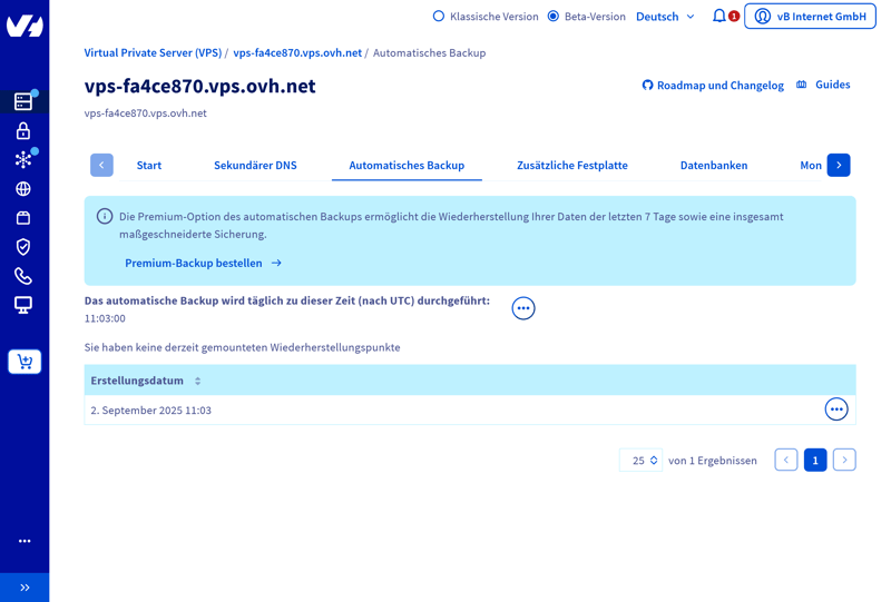 OVH erstellt standardmäßig täglich ein automatisches Backup, zu einer frei wählbaren Uhrzeit. Sie können entweder den gesamten Server wiederherstellen oder das Backup als zusätzliches Laufwerk einbinden.