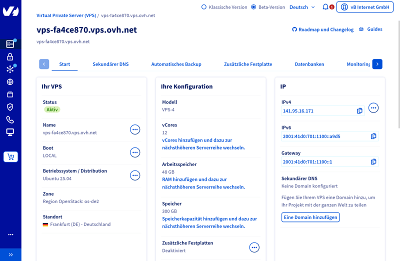 In dieser Ansicht finden Sie alle wichtigen Informationen zu Ihrem Server: vCores, RAM, Speicherplatz, IP-Adressen, Netzwerkstatus und weitere Funktionen, die über Drei-Punkte-Menüs erreichbar sind.