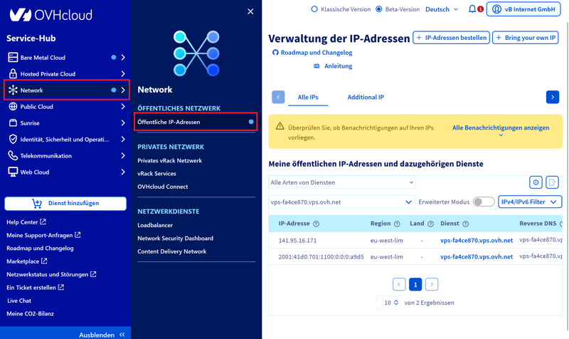 Weitere Links führen ins Help Center, zu Support-Anfragen, zu bestehenden Tickets, zum Live-Chat und zum Marketplace. Auch der aktuelle OVH-Netzwerkstatus ist dort abrufbar.