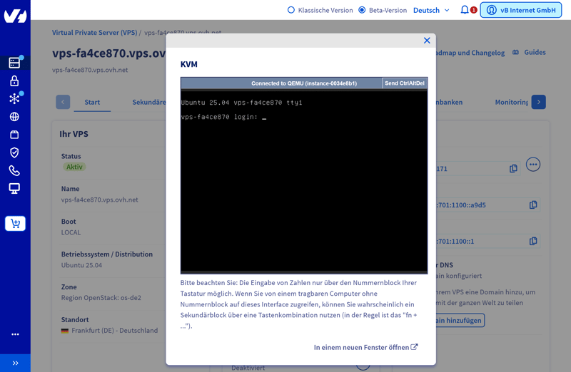 Unabhängig vom Netzwerkstatus hilft die KVM-Konsole weiter, wenn Sie direkten Zugriff auf Ihren Server benötigen. Die Konsole simuliert den Bildschirm und die Tastatur Ihres Servers im Browser. So können Sie sich einloggen, selbst wenn SSH gerade nicht erreichbar ist, oder Änderungen vornehmen, die sonst nur lokal möglich wären.