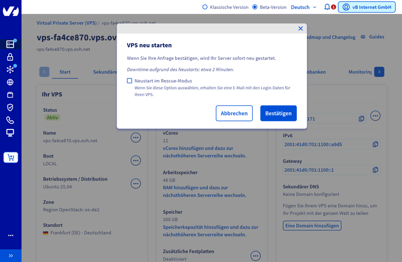 Über den Bereich „Boot“ im Reiter „Ihr VPS“ können Sie den Server neu starten. Aktivieren Sie dabei den Haken für den Rescue-Modus, fährt der Server in einer Notfallumgebung hoch. Das ist sinnvoll, wenn das eigentliche System nicht mehr reagiert oder repariert werden muss. In dieser Umgebung haben Sie Zugriff auf die wichtigsten Werkzeuge zur Fehlerdiagnose und Datenrettung.