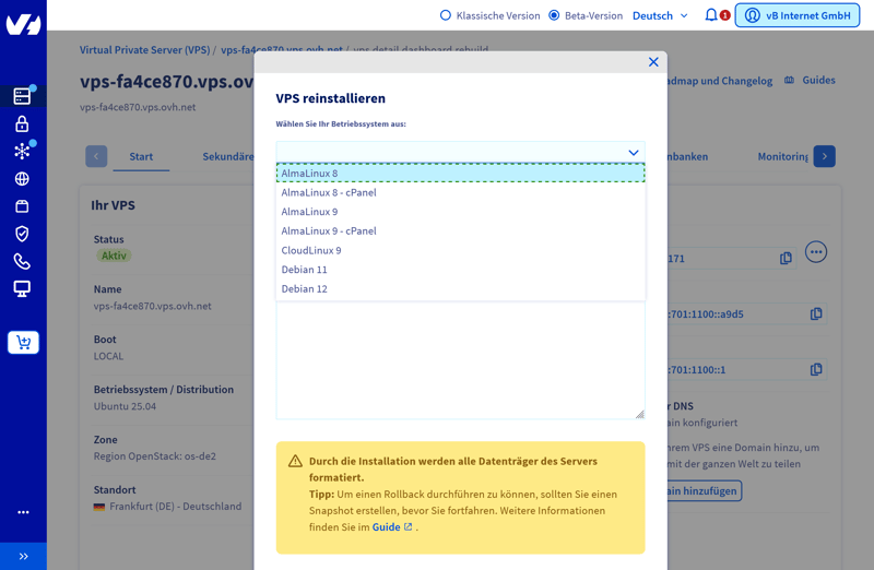 Für eine Neuinstallation stehen Ubuntu, Debian, Fedora, AlmaLinux, Rocky Linux, CloudLinux und FreeBSD zur Auswahl. OVH weist deutlich darauf hin, dass dabei alle Daten gelöscht werden und der Server während der Installation nicht verfügbar ist.