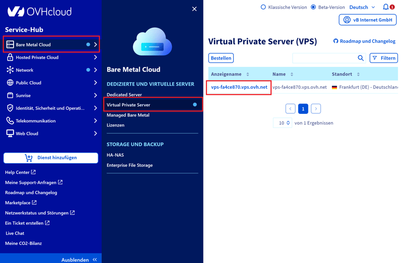 Über die doppelte Seitenleiste im OVH-Dashboard gelangen Sie zur Server-Verwaltung. Dort genügt ein Klick auf den angezeigten Servernamen, um in die Detailansicht zu wechseln.