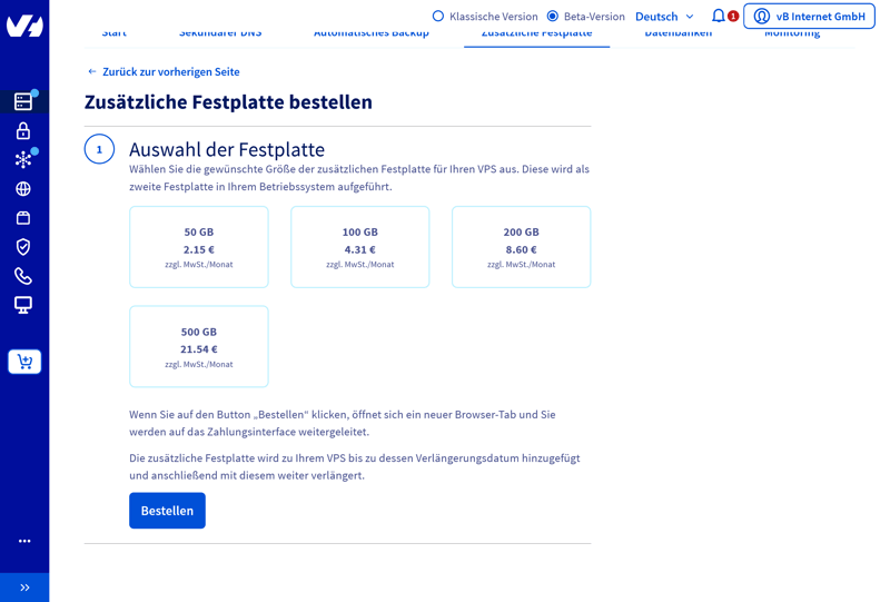 Zusätzliche Festplatten (50–500 GB) lassen sich ebenfalls buchen. Der Preis richtet sich nach dem gewählten Speicherumfang, die Abrechnung erfolgt monatlich. OVH bindet die neue Festplatte nicht automatisch in Ihr System ein: Für die Konfiguration und Einbindung sind Sie selbst verantwortlich.