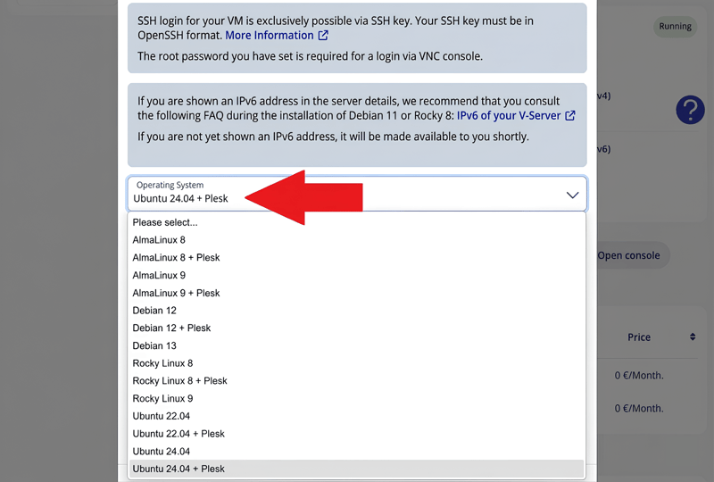Auswahl des Betriebssystems mit oder ohne Plesk.