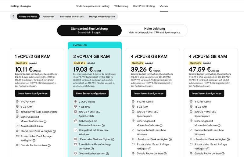 Schon für eine vergleichsweise kleine Summe erhalten Sie meist 1 bis 2 vCPUs, mehrere Gigabyte RAM und eine überschaubare Menge SSD-Speicher. Das reicht für die meisten kleineren Websites und Shops, persönlichen Projekte oder Testumgebungen aus.
