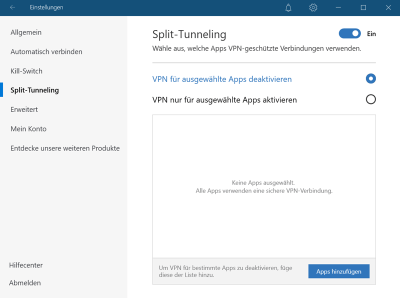 Eingebettet ist diese Power in eine intuitiv-elegante Benutzeroberfläche, die sich auf die Kernfunktionen eines VPNs beschränkt, aber auch einige Zusatz-Features wie einen Ad- und Malware-Blocker integriert hat. Eine Split-Tunneling-Funktion, die es ermöglicht, die VPN-Verbindung nur für ausgewählte Programme zu aktivieren, gibt es ebenfalls.