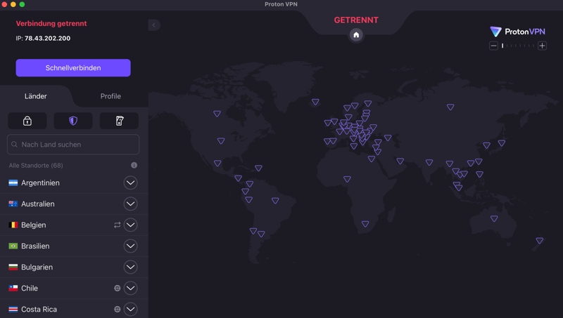 Die Weltkarte können Sie in der Proton VPN-App aus- und einklappen.