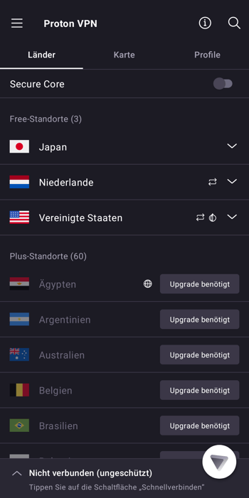 Auch Zusatz-Features, wie die vom Plus-Tarif bekannte Secure Core-Funktion, sind für Gratis-Nutzer nicht verfügbar.