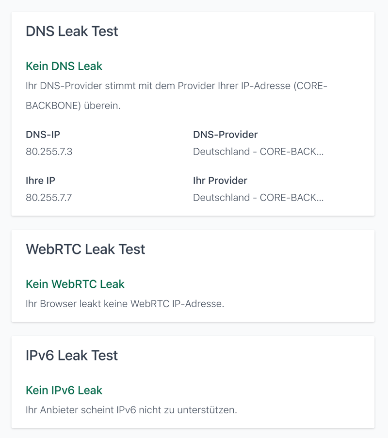 Bei unseren VPN Leak Tests (IPv6, DNS und WebRTC) kam es mit dem SecureLine VPN zu keinen Problemen: