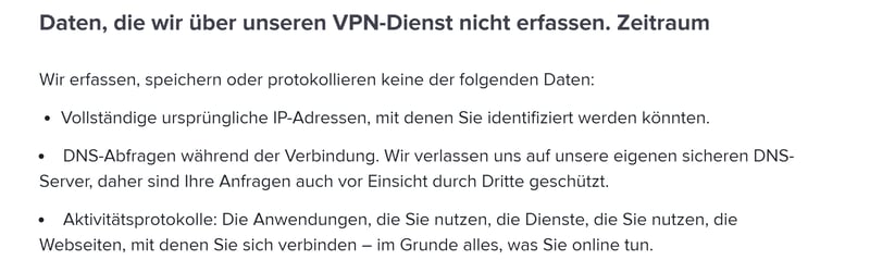 Als Zwischenhändler Ihrer Daten kann ein VPN-Dienst theoretisch viel über Sie und Ihre Gewohnheiten preisgeben, deshalb ist eine starke und transparente Datenschutzrichtlinie wichtig. Dort schreibt Avast: