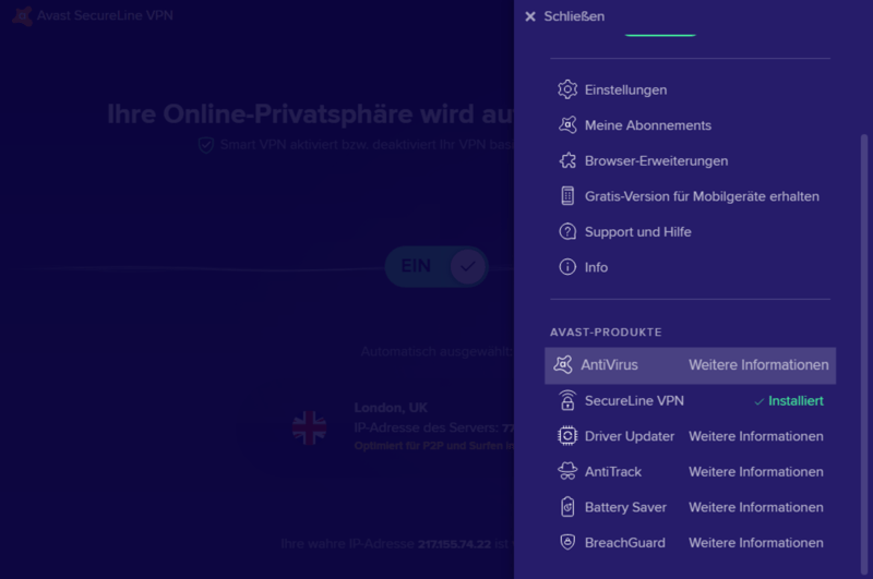 Zumindest der Mangel an erweiterten Sicherheits-Tools hat natürlich einen guten Grund: Als Anbieter einer ganzen Sicherheits-Suite möchte Sie Avast dazu verleiten, auch in die anderen Ecken seines Werkzeugkastens zu schauen. Im Menü finden Sie die anderen Avast-Produkte aufgelistet.