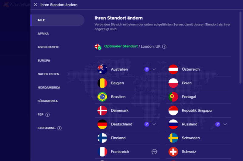 Das Server-Netzwerk von Avast SecureLine VPN ist recht überschaubar: Rund 700 Server in 34 Ländern stehen zur Verfügung, die meisten davon – wie bei VPNs üblich – in Europa und Nordamerika. Überall sonst gibt es nur vereinzelt Server, in Afrika beispielsweise nur in Südafrika, in Südamerika nur in Brasilien.
