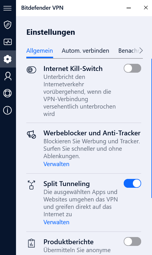In den Einstellungen finden Sie die weiteren Funktionen von Bitdefender VPN. Im Tab Allgemein ist hier beispielsweise der Kill Switch gelistet, den Sie unbedingt aktivieren sollten, wenn Sie sensible Aufgaben per VPN erledigen. Er sorgt nämlich dafür, dass die Internetverbindung sofort getrennt wird, wenn es Probleme mit dem VPN-Tunnel gibt.