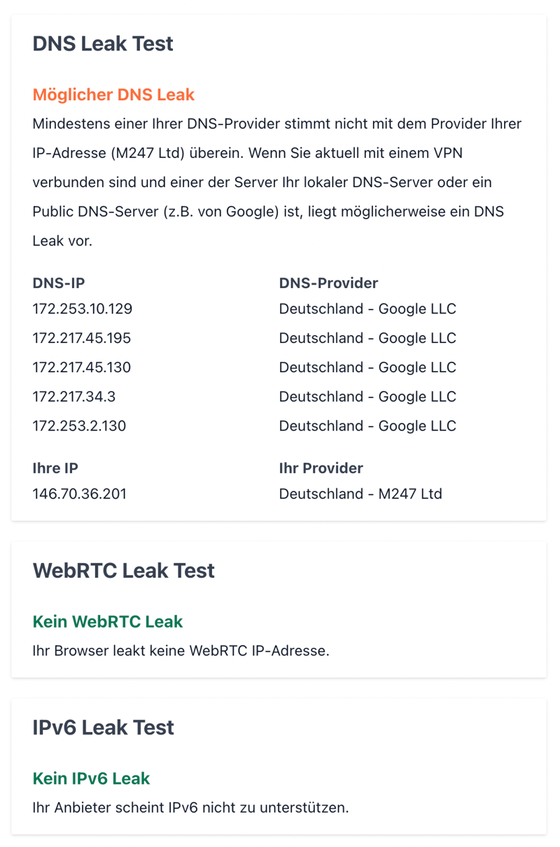 In unserem Test kam es zu einem möglichen DNS-Leak.