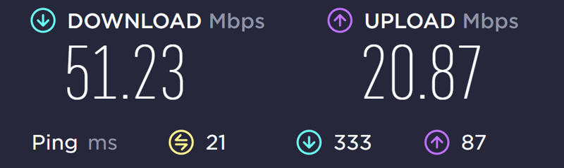 Stattdessen testeten wir die Geschwindigkeit manuell, indem wir die Upload- und Download-Geschwindigkeiten mit und ohne VPN-Verbindung verglichen. Ohne VPN-Tunnel erreichten wir zum Testzeitpunkt Upload-Speeds von 52,89 Mbit/s und Download-Speeds von 21 Mbit/s. Mit VPN-Tunnel lag der Upload bei 51,23 Mbit/s, der Download bei 20,87 Mbit/s – allzu große Auswirkungen hatte die Verbindung also nicht.
