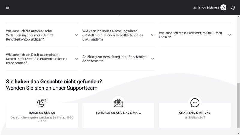 Direkten Support gibt es im Bitdefender Central-Portal: Hier punktet Bitdefender mit unterschiedlichen Kontaktwegen: Telefon, Chat und E-Mail. Die Telefone sind montags bis freitags von 9 bis 19 Uhr besetzt. Wir warteten nur zwei Minuten, bis ein Mitarbeiter frei war. Im Chat sprachen wir an einem Sonntagabend bereits nach wenigen Sekunden mit jemandem. Auch auf unsere E-Mail reagierte Bitdefender noch am selben Tag.