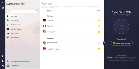CyberGhost ist ein VPN aus Rumänien, das mit einem riesigen Server-Netzwerk und einer guten Streaming-Performance punktet. Durch die mittelmäßigen Ergebnisse in unserem Speedtest und das Mutterunternehmen Kape, das in der Vergangenheit immer wieder wegen Datenschutzthemen in der Kritik stand, hat es in unserem Vergleich aber nur für Platz 8 gereicht.