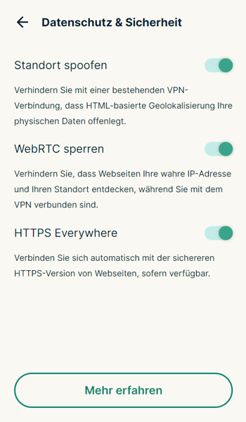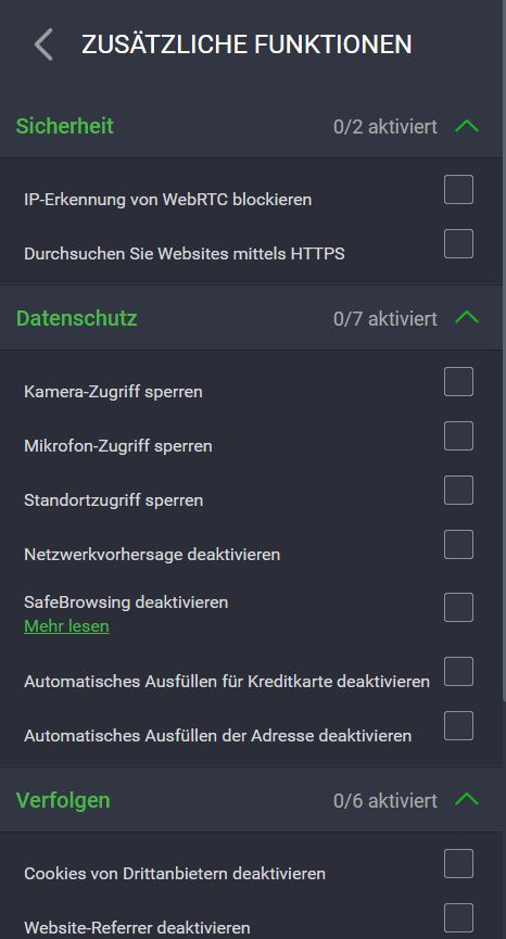 In der Browser-Version gibt es außerdem zusätzliche Sicherheits-Features wie HTTPS Everywhere, was dafür sorgt, dass Sie sich, wenn möglich, immer automatisch mit der sicheren HTTPS-Version von Websites verbinden.