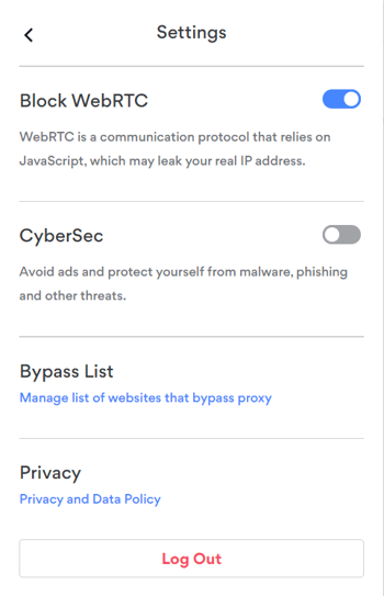 Auch die Einstellungsmöglichkeiten sind begrenzt: Mit CyberSec gibt es einen AdBlocker, außerdem können Sie eine „Whitelist“ von Websites erstellen, die den Proxy umgehen sollen.
