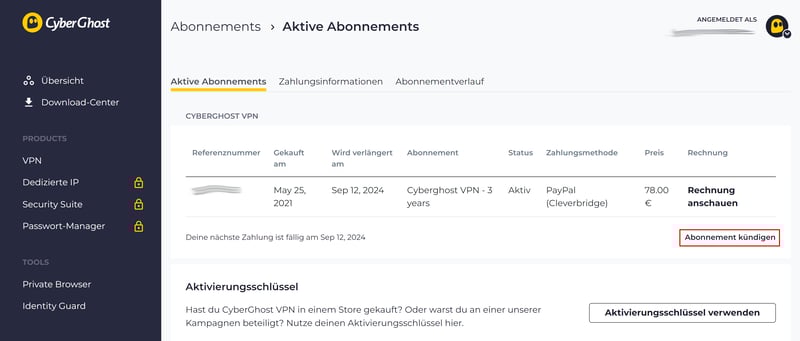 4. Hier finden Sie Ihr CyberGhost-Abo in der Kategorie „aktiv“. Klicken Sie darauf und im nächsten Schritt auf „Abo kündigen“.