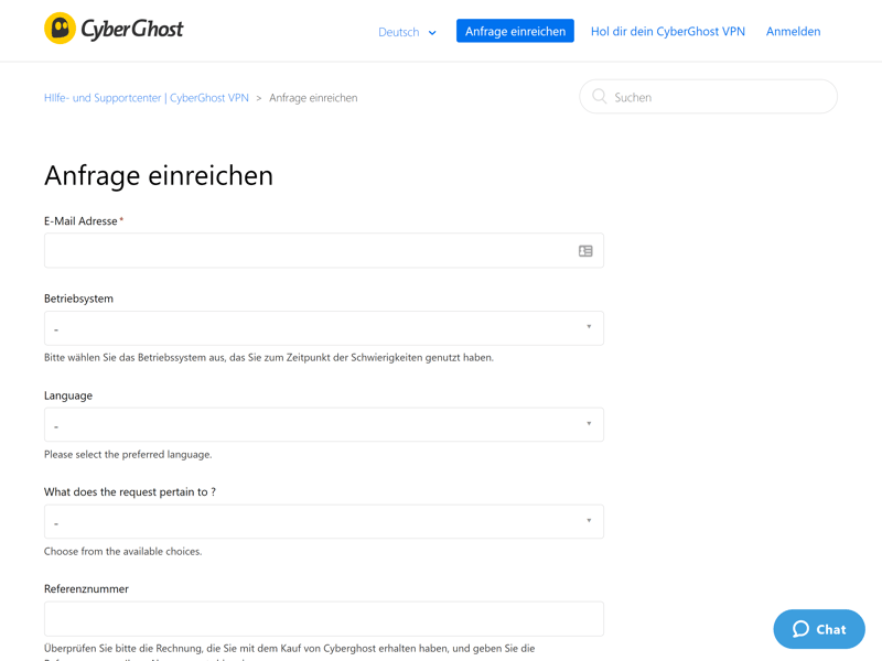 1. Klicken Sie im Support-Bereich von CyberGhost auf „Anfrage einreichen“.