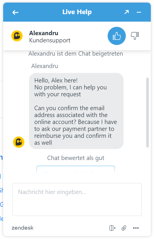 Im Chat können Sie Ihre Bitte um eine Rückerstattung direkt mit Support-Mitarbeitenden klären