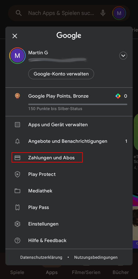 2. Klicken Sie im Menü auf „Zahlungen und Abos“.